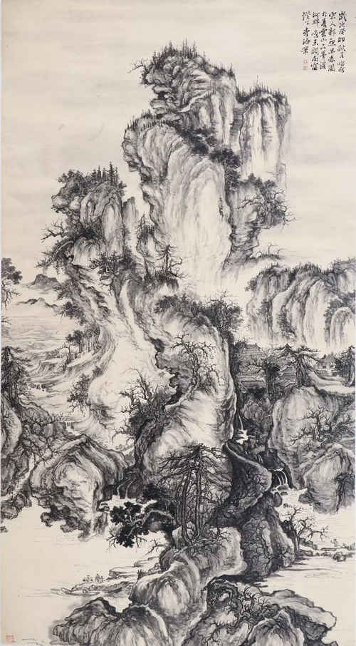 技法上,郭熙展现了炉火纯青的笔墨语言。山石以“卷云皴”(亦称云头皴)描绘,淡墨层层皴擦,形态如云气升腾,既表现了岩石的质感,又赋予山体一种流动的生命感。枯硬如蟹爪的树枝伸向天空,虽多为寒林,却在枝梢透露出点点嫩芽,暗示春意已悄然萌发。泉水自岩隙间奔涌而下,三叠而落,线条灵动,仿佛能听见潺潺水声,为静谧的山林注入生机。