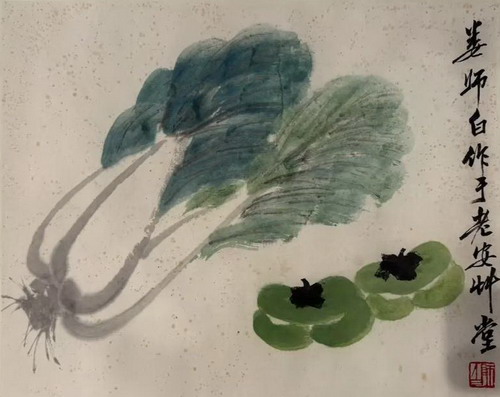 - **绿色白菜**:在画好的墨稿上,用花青加藤黄调出汁绿,顺着叶脉方向进行罩染,注意留出飞白,不要填满。