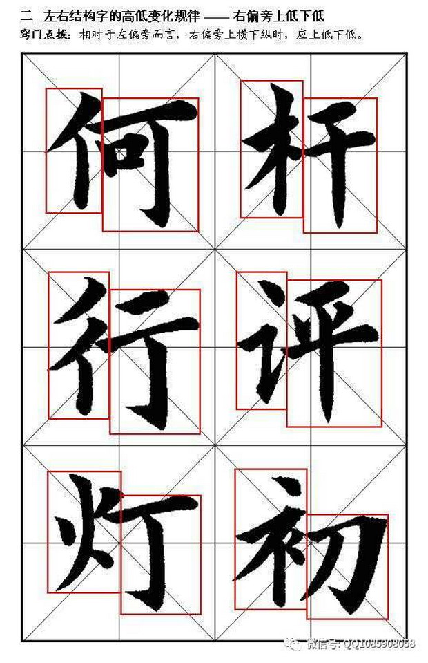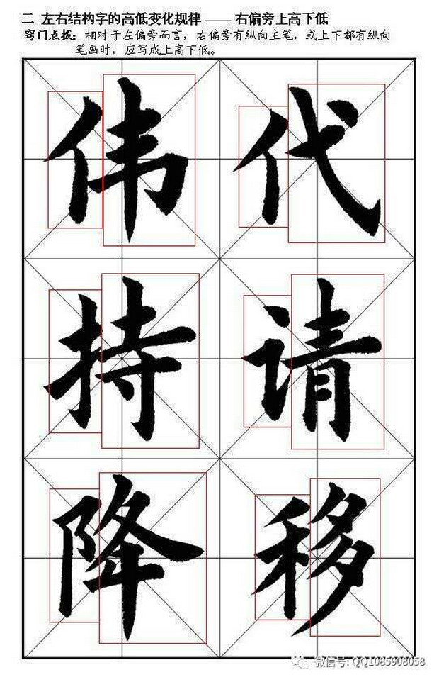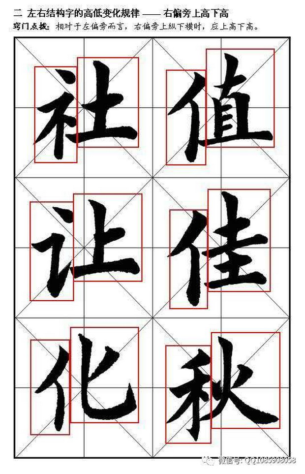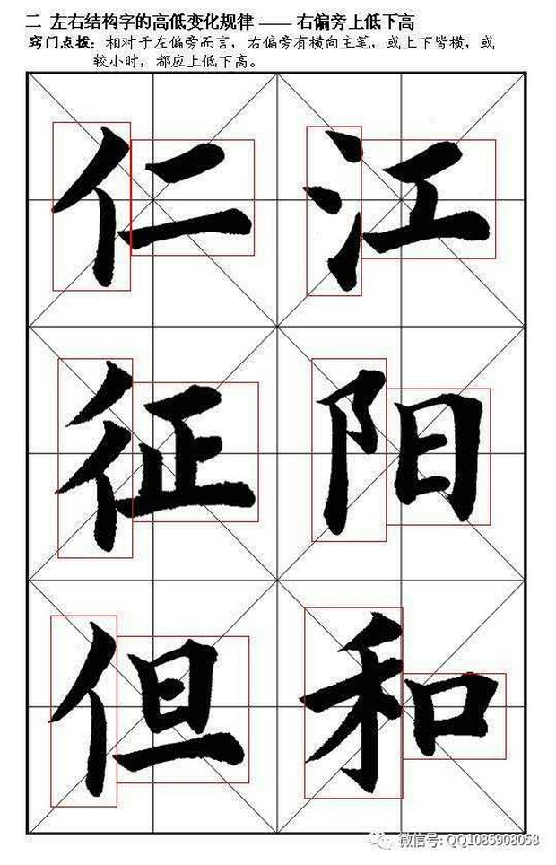 为了便于初学者掌握这四大规律,我用四个字概括为: 右偏旁要横收纵放。即横向笔画(横、横折、撇捺的收笔、平撇、竖弯钩横向部分)在上要下压得比左偏旁低,在下要提升得比左偏旁高,整个右偏旁往中部压缩。纵向笔画(竖、竖钩、撇起笔)在上要提升得比左偏旁高,在下要延伸得比左偏旁低,整个右偏旁往上下拉长。