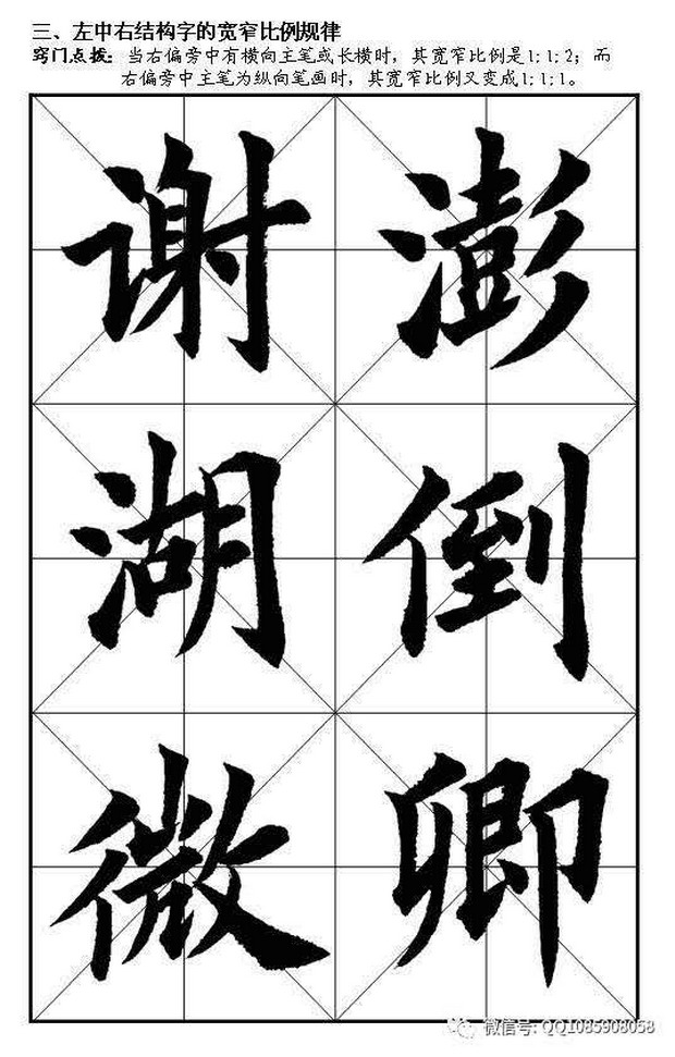 由于此类字大多数都是在左右结构字的左部加左偏旁,因此左中右结构字的特点是两个左偏旁加一个右偏旁,当右偏旁中有横向主笔时,其宽窄比例是1:1:2,写时将左部和中部压缩到方格左半部,让出右半部写右偏旁;而右偏旁中有纵向主笔时,其宽窄比例又变成1:1:1,写时左右两部以中部为轴对称。注意左右都要让出适当空间,不要向两边挤导致整体松散。