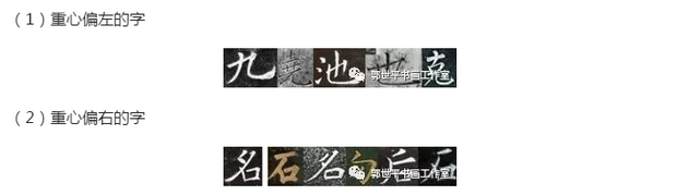 写字时,字的重心不稳,会给人以惊惧之感,而觉其丑。所以古人结字首先要求“平正”。字的局部重心可以不稳,但是整体重心必须归于平稳,方合规矩。一切结字的方法与手段,都必须在遵循此原则的前提下加以运用,否则,字形终归毁灭。结字时,针对不同的字,把握重心的角度也各异,主要体现在以下方面: