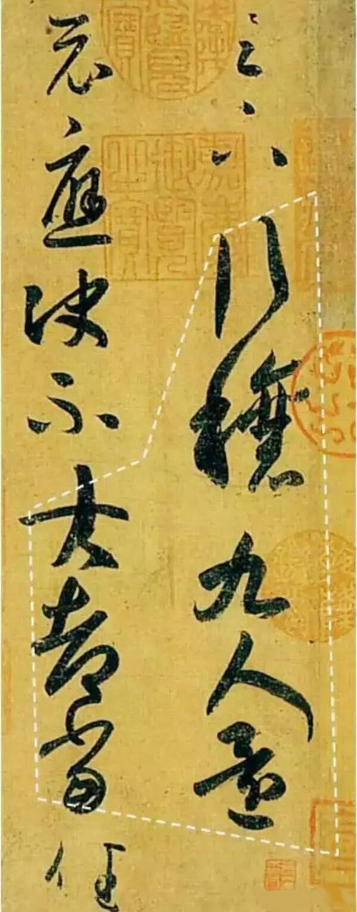 1、王羲之的《行穰帖》,开始的“足下”笔画之间的空间比较大,笔画也比较轻,最后的“佳”也比较轻,是“虚”的部分,中间白线圈住的部分,笔画比较重,这样,整体上的虚实关系比较清晰。