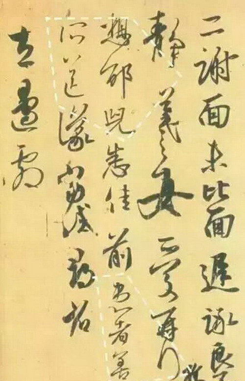 2、王羲之的《妹至帖》,有三个地方笔画处理得比较轻巧、灵动,白线圈住的“之可言”、“夕”、“虑、三”,比起其他地方显得“虚”。