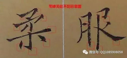 2、“笔锋无处不到”。任何一点一画,从始至终,四面八方,都应是笔锋运走形成的。如写一点顿下后,须顿中有提,使笔锋走至原笔腹按下的位置,使笔力充分作用于纸面,如此方得收笔处坚实凝重的笔触。