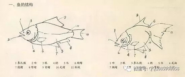 左鱼:1鼻孔膜 2吻 3眼 4腮 5体 6胸鳍 7腹鳍 8臀鳍 9背鳍 10尾鳍 11侧线