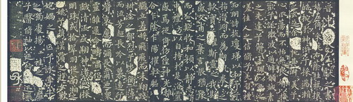 此帖章法纵紧横疏,气势开阔,每行字的大小、轻重、正欹、宽窄,错落有致,极尽自然之趣,体现出一种雄浑厚朴、沉着高古的艺术风格。