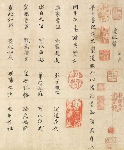 《道服赞》用笔劲健而清整,笔触坚实,绝无浮掠懈怠处。此帖在清劲中有法度,但少肉,结字方正端谨,风骨峭拔,得王羲之《乐毅论》的笔意,这正是范氏书作的特点,时人称其"文醇笔劲,既美且箴"。