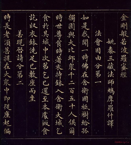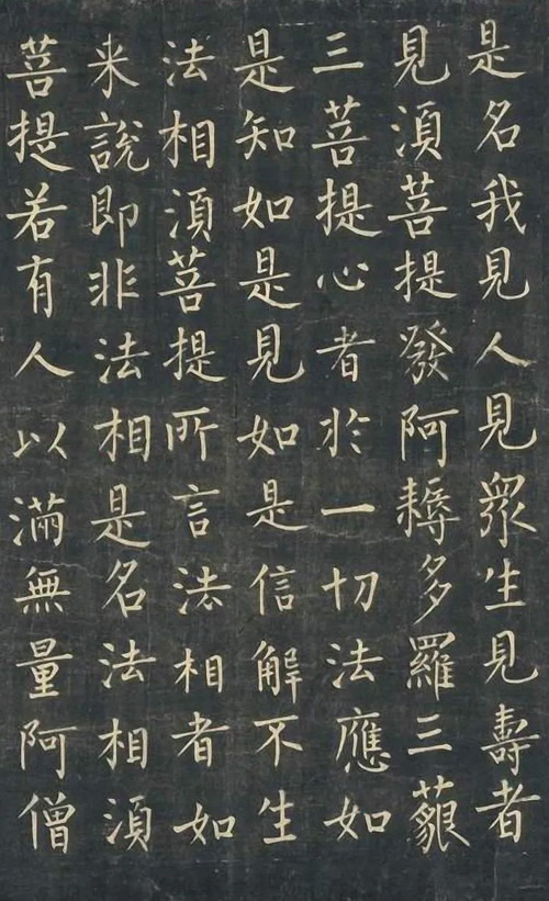 《金刚经》为柳公权早期作品,字不大但用笔灵巧劲健,虽近颜法,但明显地摒弃了"蚕头雁尾"的用笔,而多融入魏晋及初唐楷意,并掺之以北碑的骨力,所以表面看上去感觉平常,有剑拔弩张之势,但仔细观察则富于变化,方劲中有清灵通秀之气,节奏明快,极富动感,整体法度森严而富庙堂气象。