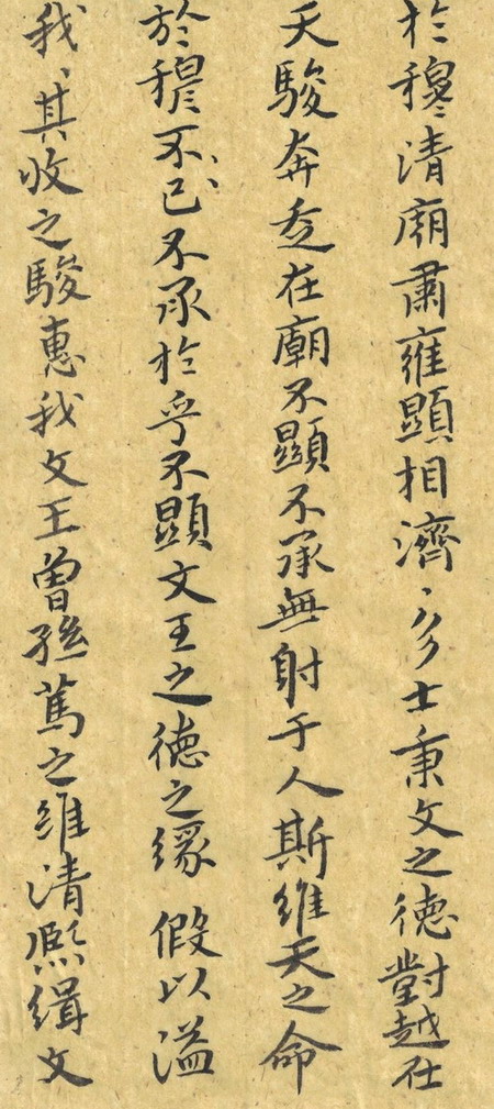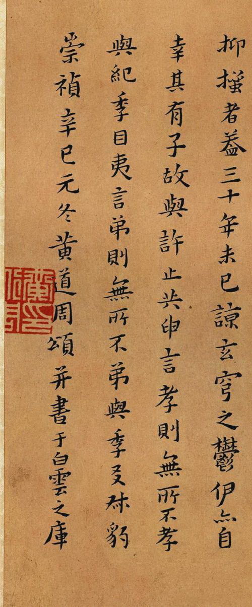 此小楷《孝经》用笔简洁,结字宽博,气势舒缓,于凝重中见姿媚。