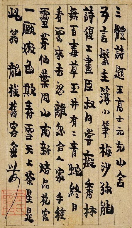 金农(1687一1763),字寿门,又字吉金,号冬心,浙江仁和人。博学多才,善诗词,精鉴赏,喜收藏,工书画,用笔方扁,号为"漆书"。金农从篆书中取其神,变其形,又从金石文字中广泛吸收,形成了带有篆书气质和金石昧的隶书。其楷书又从隶书中来,以重为巧,以拙为妍,醇古方整。