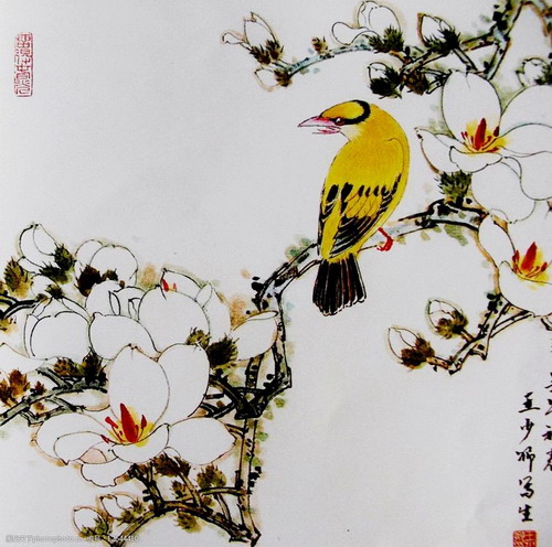 以他的代表作《玉兰黄鹂》为例,画面以深邃宁静的蓝色为底,衬托出枝头洁白高雅的玉兰花,其间点缀着羽毛鲜艳的黄鹂。深蓝与明黄、雪白形成强烈的视觉冲击,但这种“浓丽”并未破坏画面的雅致,反而在平涂的装饰意味与写实的花树形态之间找到了平衡。这种处理方式,既突出了“活色生香”的视觉效果,又保留了文人画的精神内核,使观者在蓝天下感受到玉兰的纯净与生机。
