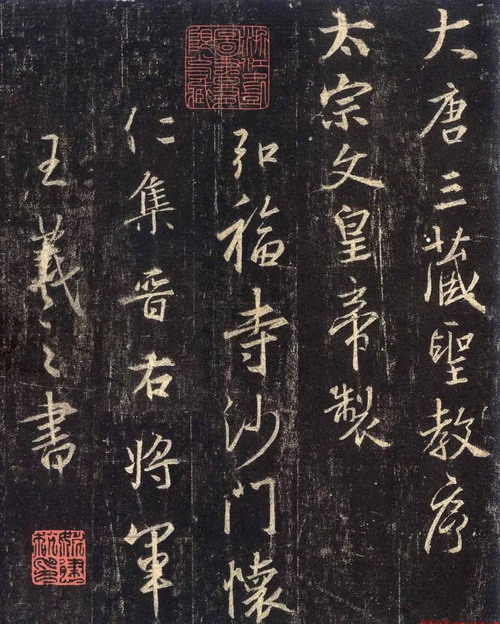 《大唐三藏圣教序》,简称《圣教序》,由唐太宗撰写。最早由唐初四大书法家之一的褚遂良所书,称为《雁塔圣教序》,后由沙门怀仁从王羲之书法中集字,刻制成碑文,称《唐集右军圣教序并记》,或《怀仁集王羲之书圣教序》,因碑首横刻有七尊佛像,又名《七佛圣教序》。集王圣教序碑刻立于唐咸亨三年(六七二),碑通高三五零、宽一零八、厚二十八厘米。碑文三十行,行八十三至八十八字不等。