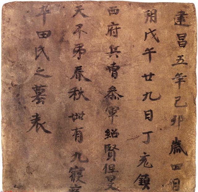 《田绍贤墓表》,砖,墨笔,纵34.3、横34.3、厚3厘米。北京故宫博物院藏。高昌建昌五年(北周武成五年,559年),墨书五行四十四字。北朝后期墓志书法峭厉,此表和《赵荣宗妻韩氏墓表》则已趋圆美。墓文与佛经的书写都应郑重、工整,然而佛经要求更加严谨、整饬,于是在特定的时期和地区内形成有特色的经生体,这又是二者的差异。