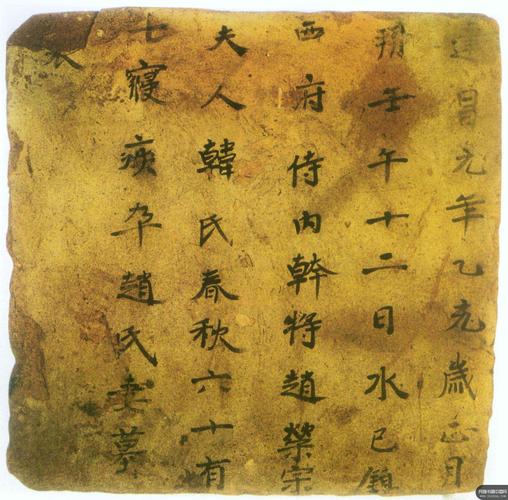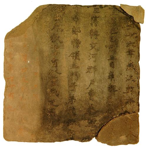 《赵荣宗妻韩氏墓表》砖,墨笔,纵35×横35×厚3.7厘米。北京故宫博物院藏。高昌建昌元年(555年),墨书六行四十五字。墓砖有刻字填朱和直接墨书或朱书两类,后一类往往先涂一层粉垩使砖面平滑易写,粉垩吸水性强,使提按转折、浓淡燥润的用笔历历在目。