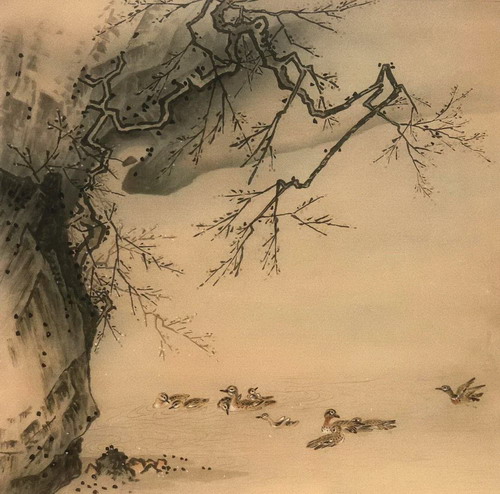 画面呈典型的对角线式构图,岩石、梅树都偏居画面的左上部分,梅树枝条的走势更强调了此种布局的形式感,右下方的野鸭既起到了平衡画面的作用,又是全图的点睛之笔,一幅“春江水暖鸭先知”的景象,无限生趣,跃然绢素。