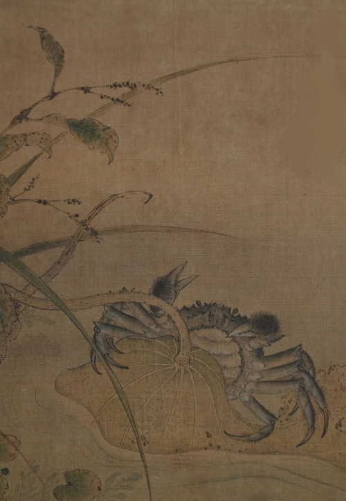 残败的荷叶枯黄斑驳,半浸水中,一只团脐雌蟹挥螯伏于叶上。潺潺流水中有水生植物红蓼、蒲草、浮萍、水藻等,叶片边沿均以泛黄,显示出秋日的来临。金秋时节,正是蟹美膏肥之时,荷叶的颓势与雌蟹的鲜活形成强烈的对比。