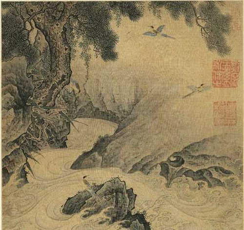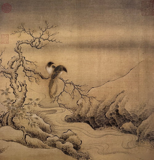 雪后溪边,天色晦冥,老梅初放。树栖绶带鸟一双,毛羽绚烂。树下溪流湍急,水花飞溅。岸石上覆盖积雪,画家以水墨烘染阴天,以白粉表现积雪,以流畅的曲线描绘流水,最为独特的是为了表现溪岸岩石为水冲蚀形成的蜂窝之状,另创皴法,前此未见。