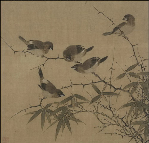 5只文鸟集于枯棘上,姿势各异,神态如生。枯棘下的竹枝色黄叶疏,点明了瑟瑟秋意。画家将聚集4只文鸟的重心着落于画面中心偏左的位置,而将另一文鸟绘于右侧高处的棘枝上以分散重心,但它回眸向下的眼神与另外4只相呼应,如此布局使画面既错落有致而重心突出。