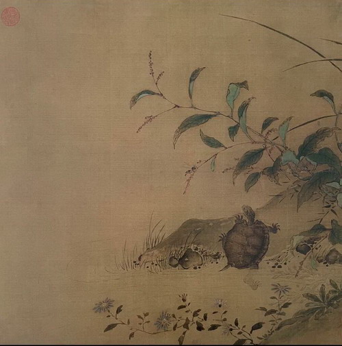 溪水岸边,泥坡碎石,红蓼吐蕊,野菊绽放。一只老龟缓缓爬上坡岸,未及出水,便被蓼花上的小蜂所吸引,驻足昂首仰望。其悠闲自在、与世无争的状态通过仍浸于池中的后足得以充分表现。