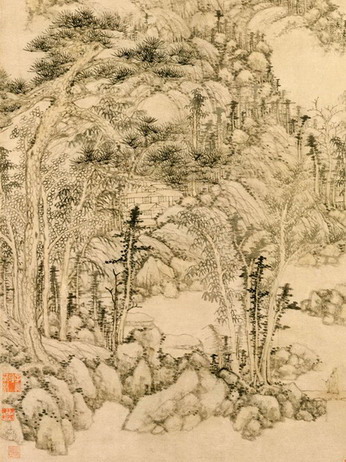 《天池石壁图》和《丹崖玉树图》是他浅降山水的代表作,两图手法略同,均为重峰叠岭,高松层崖,山峦树木的造型和勾勒法源自董、巨,笔法变繁复为简疏,多用干笔皴擦,化宋人的实质为虚灵。