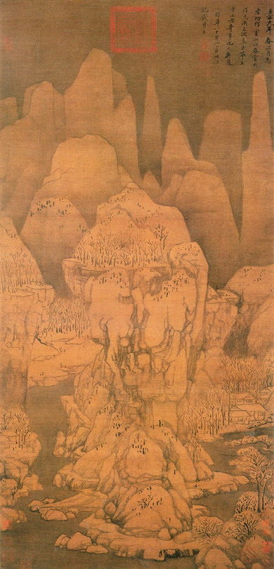 图绘高岭竞力,层岩蜂起,丘壑峣峥,冻树萧瑟,表现隆冬腊月,气候严寒的山区景象。图中山峦纯用笔墨空勾,淡墨渍染。水和天空用浓墨渲染,烘托出白雪皑皑大雪初霁的山峰景色。