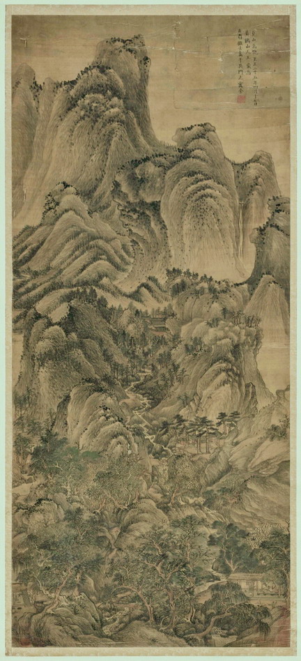 此图设色绘重山叠翠,瀑布孤悬,林阴繁荟,流泉下注。