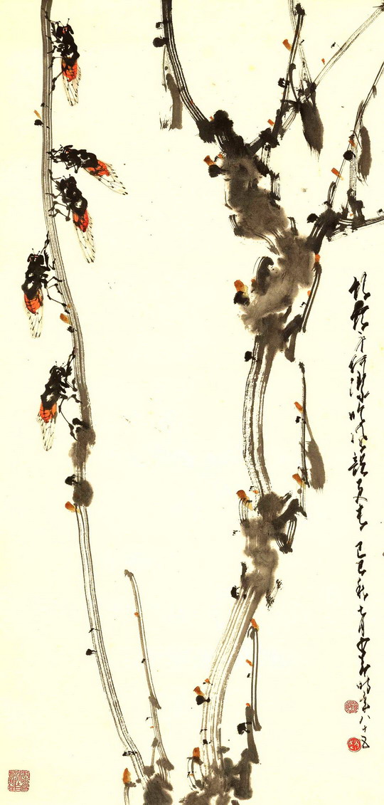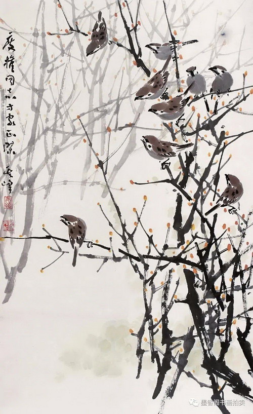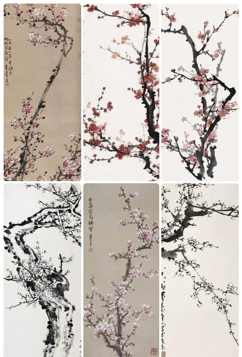 2、三线体:就是构图以主线、辅线、破线三条线作为主要构成的手法。树干主干的走向是构图的主线,另有衬托的枝干随主干走向辅排,起著陪衬辅助作用,即辅线。然后另出旁枝从主线破出,使构图多样变化,这根线就叫破线。主线主导著画中气脉走向,而辅线则增加层次,破线用于对主线进行反衬,更加明确画面的主、次关系。