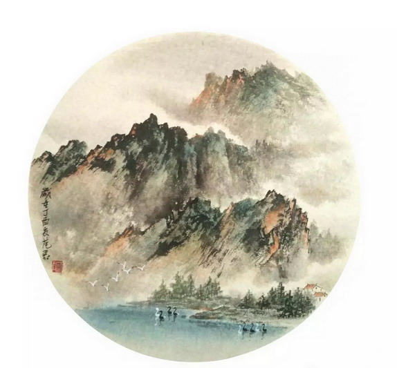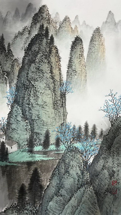 7、段迭式:即“三迭两段”。所谓“三迭”,是指“一层地,二层树、三层山”,所谓“两段”是指“景在下,山在上,俗以云在中,分明隔作两段。”因此,在山水画中,“三迭两段”的构图形式十分之多见。当然“迭”可有三迭,也可以有四迭、五迭。段亦然…。