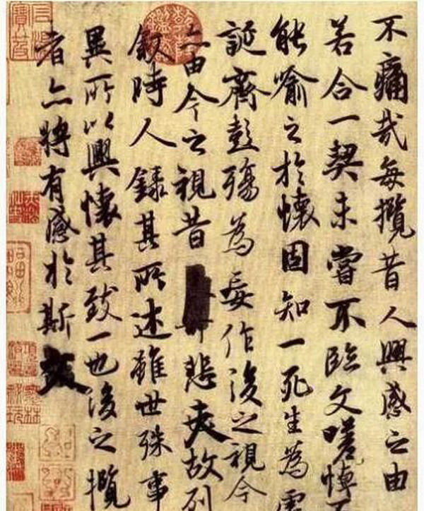 章法又称为“分间布白”,是研究字与字,行与行,以及整幅字之间的布局方法。观赏一件作品给人第一眼的印象,就是布局的艺术效果。不同的布局方法,是形成不同风格的重要条件之一。章法集众字而成篇,以整幅为一体,在书法技巧中,虽是一个独立的部分,但却与运笔的节奏,墨韵的变化,笔力和气势,结构和意境等方面有着密切的关系。《兰亭集序》终篇结构,首尾相应,笔意顾盼,偃仰起伏,似奇反正,血脉相连,一气贯注。所以在布局上达到了上下承接,左右呼应,打叠成一片,通篇章法团聚不散的效果。
