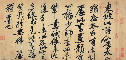 “质”是指点画的质地、质感、份量、力度、文采等。有质感的点画,其意味风韵,浑厚含蓄,其表虽朴实而无外饰,其里却“藏骨抱筋,含文包质”,这是一种内在而深刻的美。颜真卿的《祭侄稿》、杨凝式的《韭花贴》、李建中《土母帖》和張旭《古诗四帖》,尽管风格不同,但都能给人以一种浑厚饱满、沉着顿挫、痛快淋漓、骨肉相称的艺术感受。